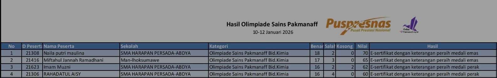 Lhokseumawe (Suci Ramadhani) – Pada 10 Januari 2026, Miftahul Jannah Ramadhani, siswa kelas X-1 berhasil meraih medali emas dalam ajang Olimpiade Pak Manaf Bidang Kimia yang diselenggarakan secara daring (online) berbasis web.